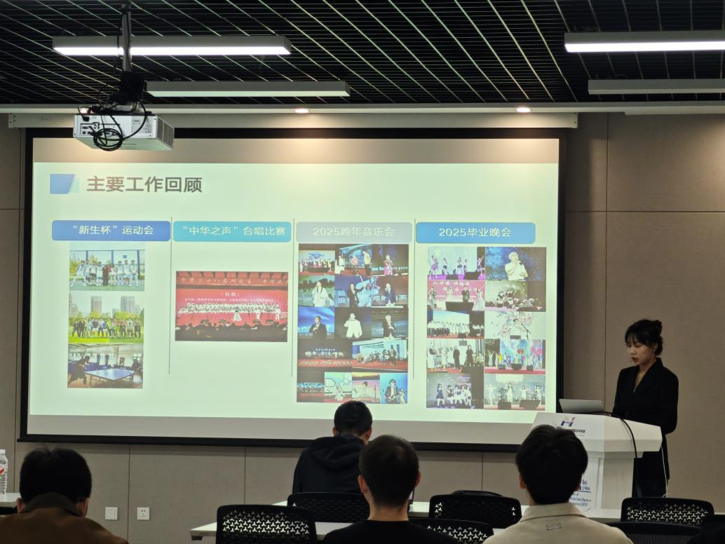 学院文体中心主席团成员刘梦绮简单介绍了文体部门结构和职能,文化中心是校园文化的燃擎引擎,过去一年里,文体中心组织了“新生杯”运动会,“中华之声”合唱比赛等一系列学院文体活动。然而,文体中心也存在三校区联动及活动创新的问题。最后刘梦绮展望未来,文体中心将打造人工智能学院更具特色的文体活动。