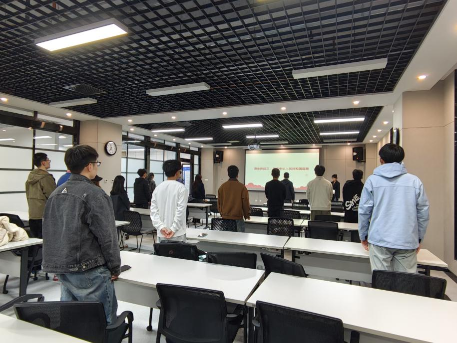 会议开章,全体到场人员起立齐唱国歌。悠扬的国歌不断回荡,心中的国旗随风飘扬,在庄严肃穆的氛围中,人工智能学院第三次研究生代表大会就此掀开序幕。