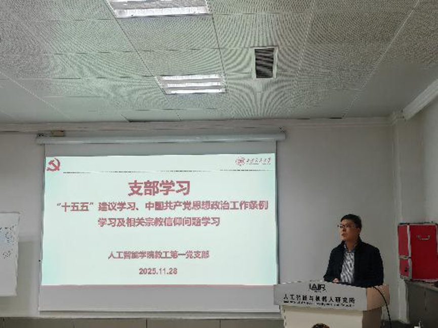 为深入学习贯彻党的二十届四中全会精神,深刻领会新时代新征程党和国家事业发展的重大决策部署,2025年11月28日下午,人工智能学院教工第一党支部在科学馆315会议室开展专题理论学习。会议重点学习了《中共中央关于制定国民经济和社会发展第十五个五年规划的建议》(以下简称“十五五”规划建议)及《中国共产党思想政治工作条例》,会议由支部书记刘龙军同志主持。